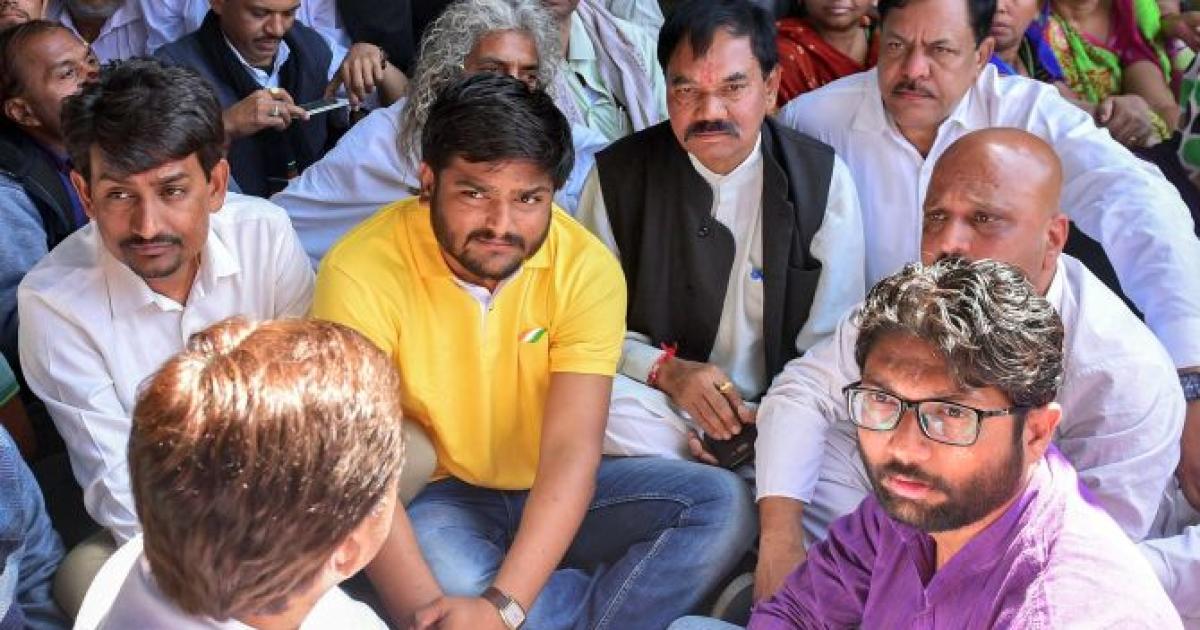 Image: Patidar leader Hardik Patel along with MLA Alpesh Thakor, Jignesh Mevani and relatives of Dalit activist Bhanubhai Vankar at CivilHospital in Gandhinagar. Photograph: Santosh Hirlekar/PTI Photo