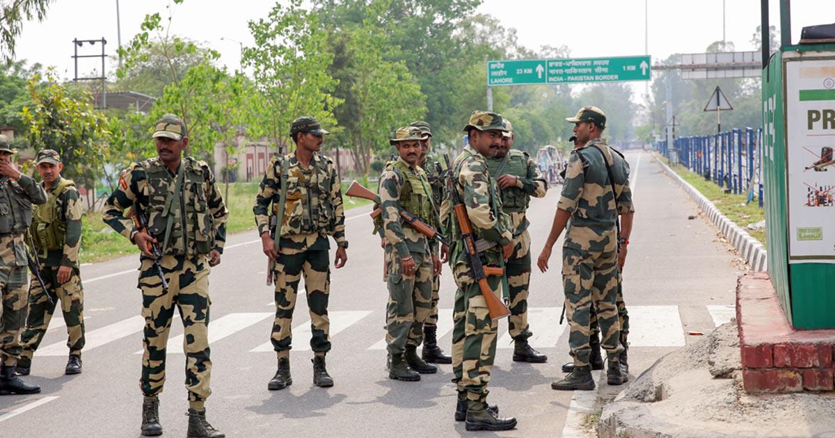 IMAGE: BSF personnel stand guard near Attari Wagah border in Amritsar. Photograph: Raminder Pal Singh/ANI Photo