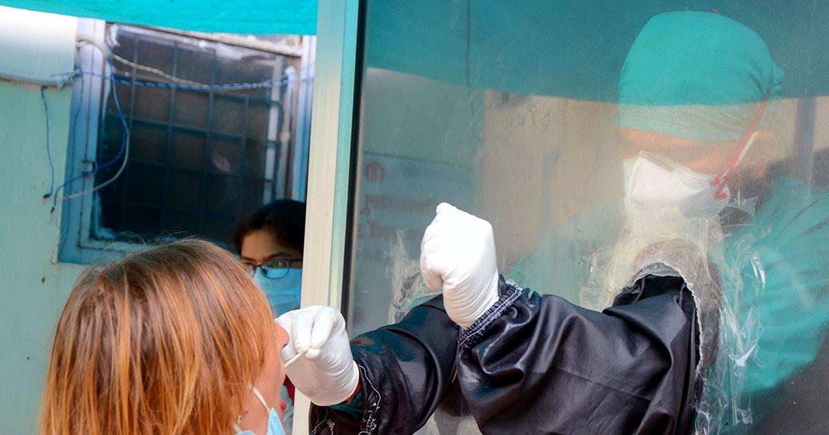 IMAGE: A health worker collects a swab sample from a foreign devotee for the COVID-19 test before leaving for the Char Dham Yatra, in Haridwar on Saturday. Photograph: Rameshwar Gaur/ANI Photo