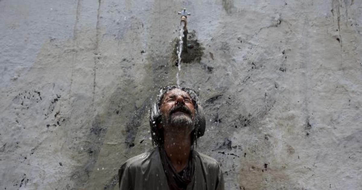 A man cools off from a public tap after filling bottles during intense hot weather in Karachi. Photograph: Akhtar Soomro/Reuters