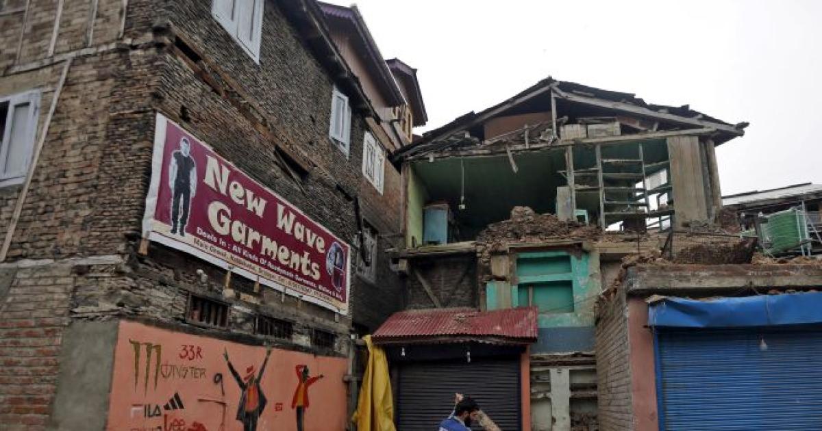 Image: A man clears debris after his house partially collapsed following an earthquake in Srinagar. Photograph: Danish Ismail/Reuters