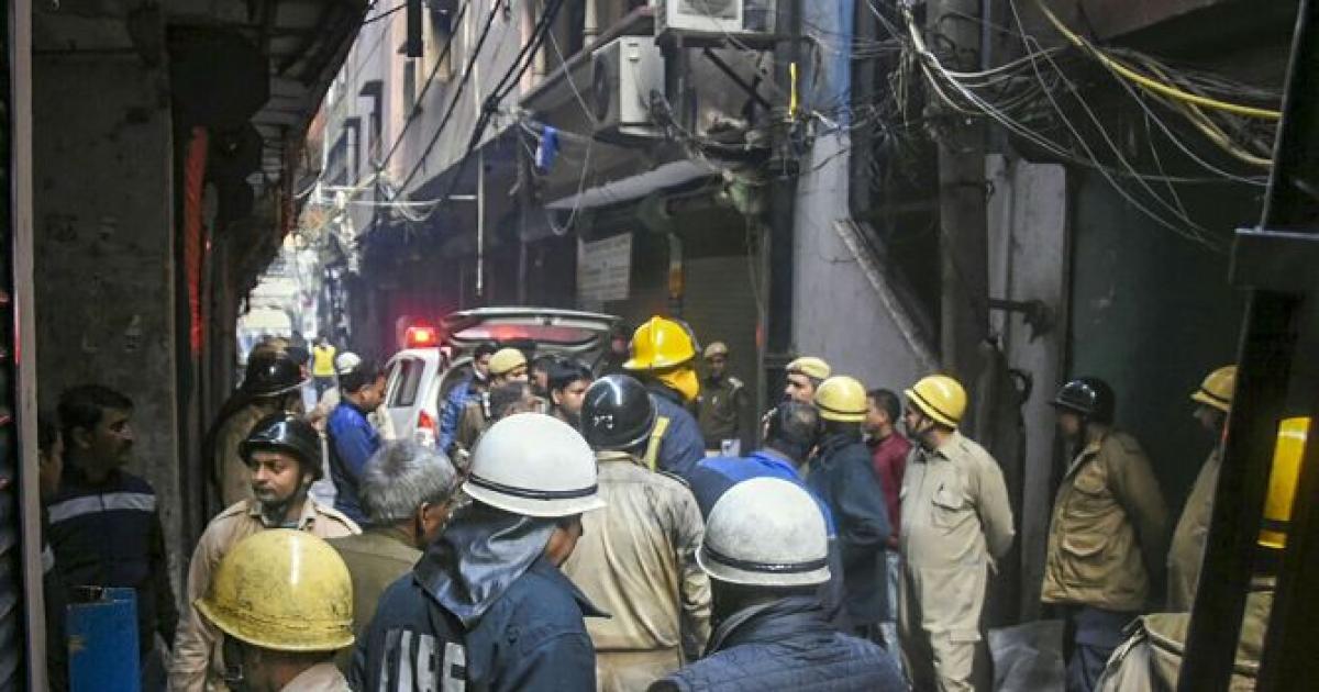 IMAGE: Firefighters carry out rescue operations at Rani Jhansi Road after a major fire broke out, in New Delhi, on Sunday. Photograph: PTI Photo