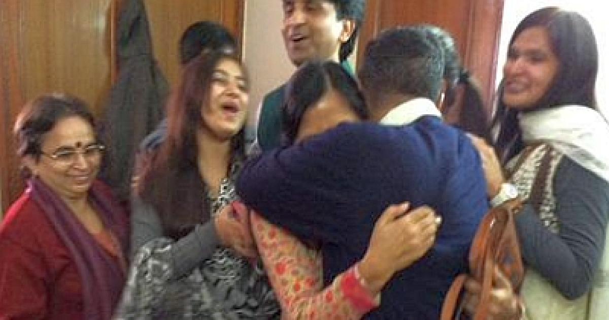 Image: Kejriwal hugs his wife Sunita after the AAP chief won the New Delhi assembly seat contest. Photograph: Twitter