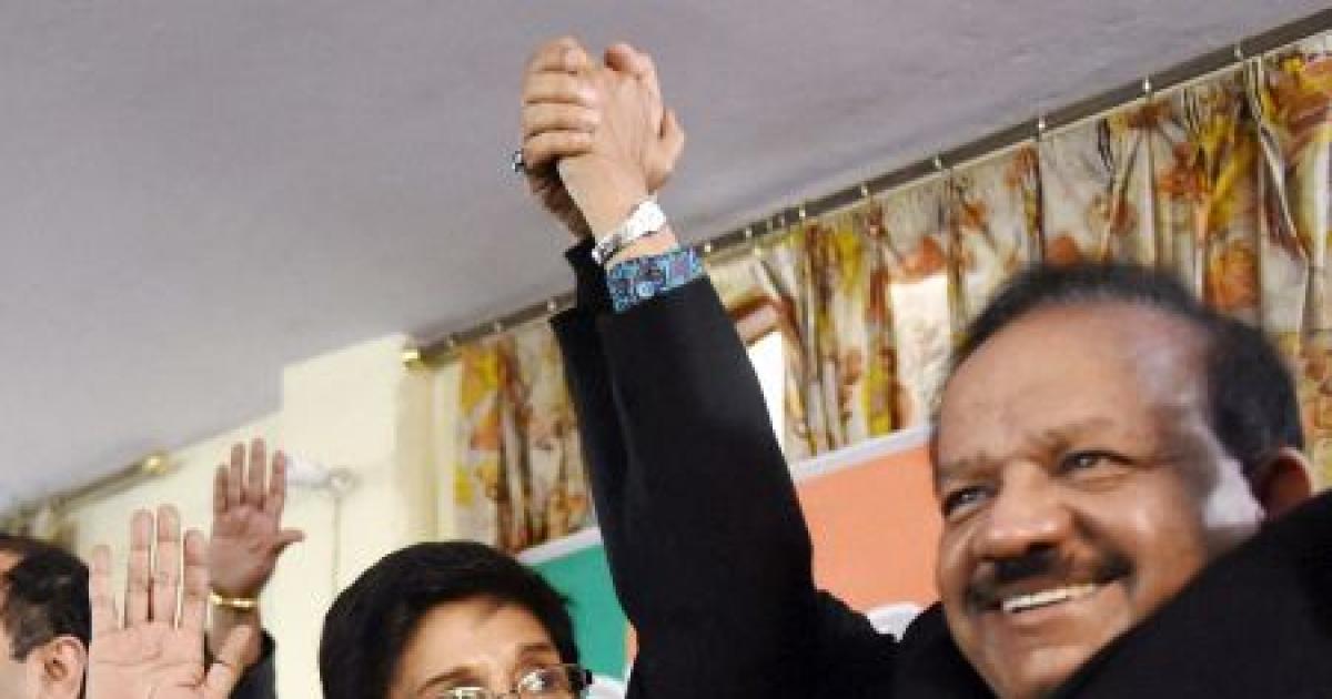 BJP Chief Minister candidate Kiran Bedi with Union minister Harsh Vardhan during election campaign at Krishna Nagar area in New Delhi on Tuesday. Photograph: Atul Yadav/PTI
