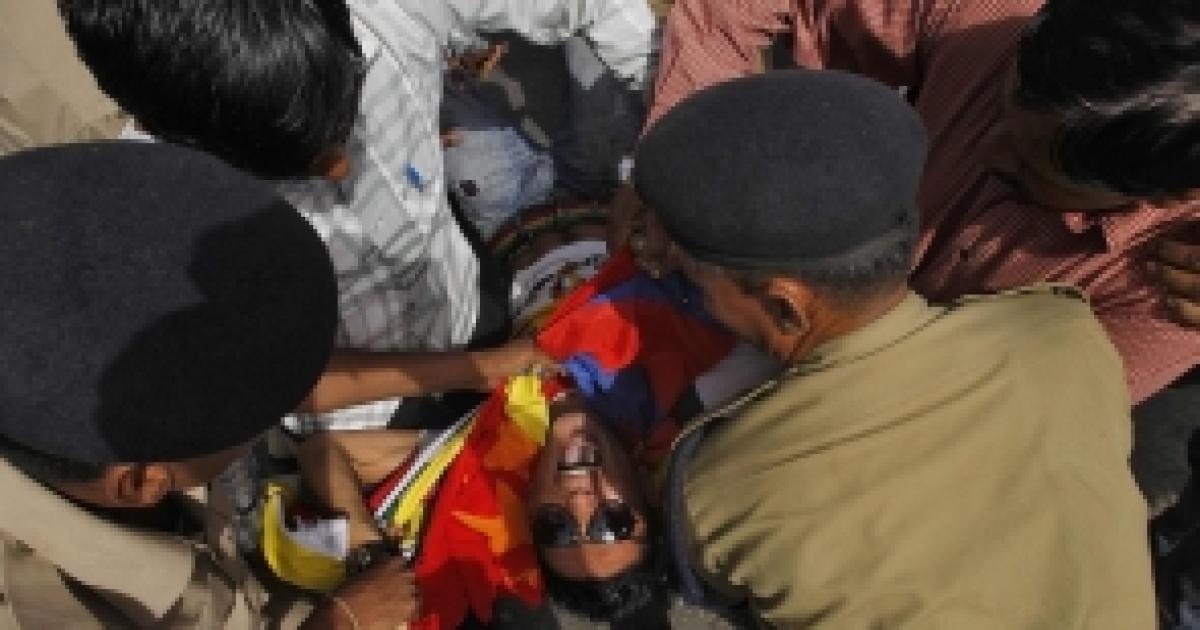 Image: A Tibetan exile is detained by police outside the Chinese embassy during a protest against the visit of Chinese Premier Li Keqiang, in New Delhi | Photograph: Oleg Popov/Reuters