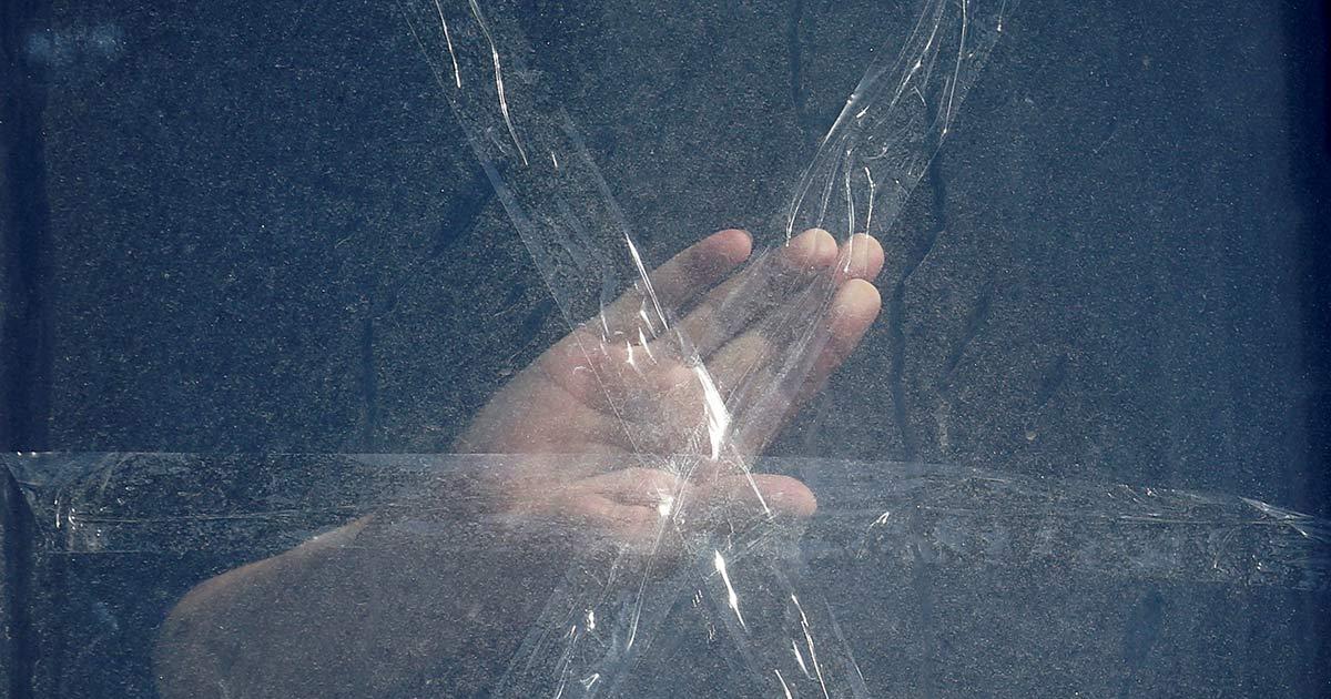 IMAGE: A local resident applies sticky tape to a window near the site of night fighting with Russian troops in Kyiv.