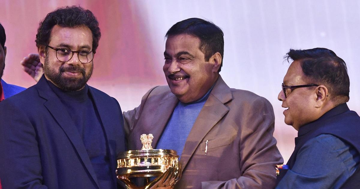 IMAGE: Union Minister for Road, Transport and Highways Nitin Gadkari hands over the 'Best Newcomer MP 2023' award in Rajya Sabha to CPI-M's John Brittas (left) during the 'Lokmat Parliamentary Awards 2023', at Ambedkar International Centre in New Delhi, February 6, 2024. Photograph: ANI Photo