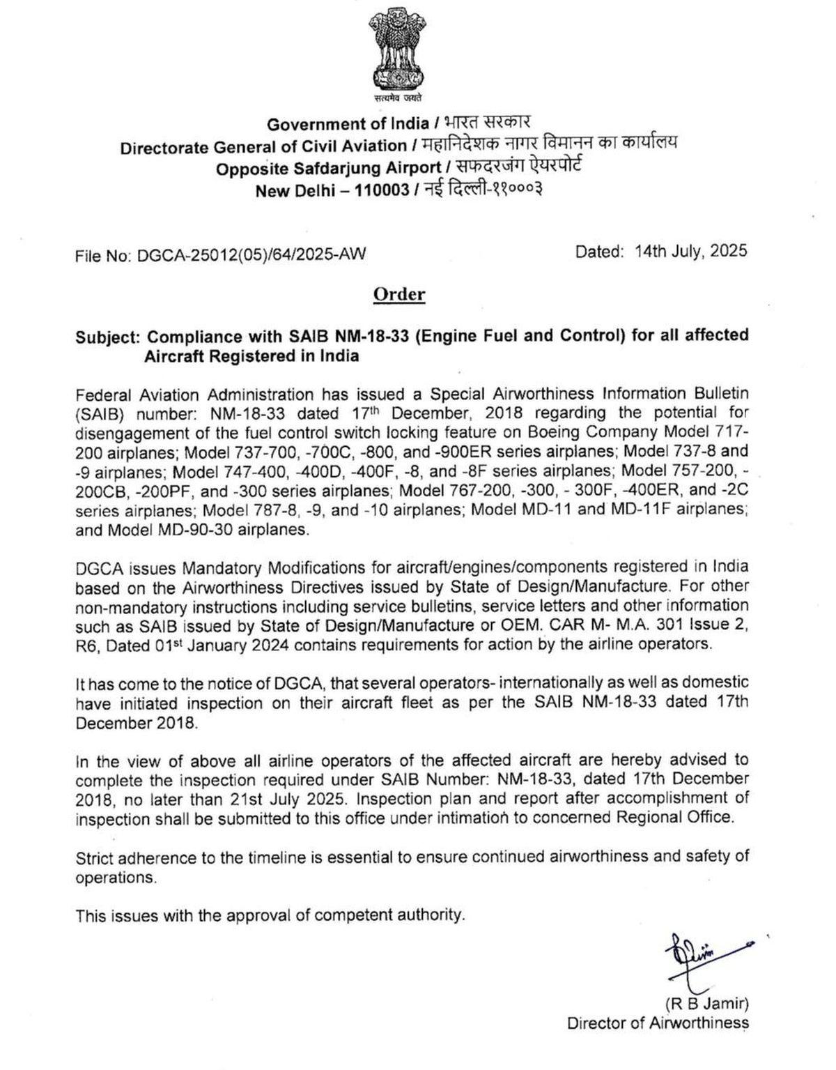 '... all airline operators of the affected aircraft are hereby advised to complete the inspection... no later than 21st July 2025. Inspection plan and report after accomplishment of inspection shall be submitted to this office under intimation to concerned Regional Office,' the DGCA said in an order.