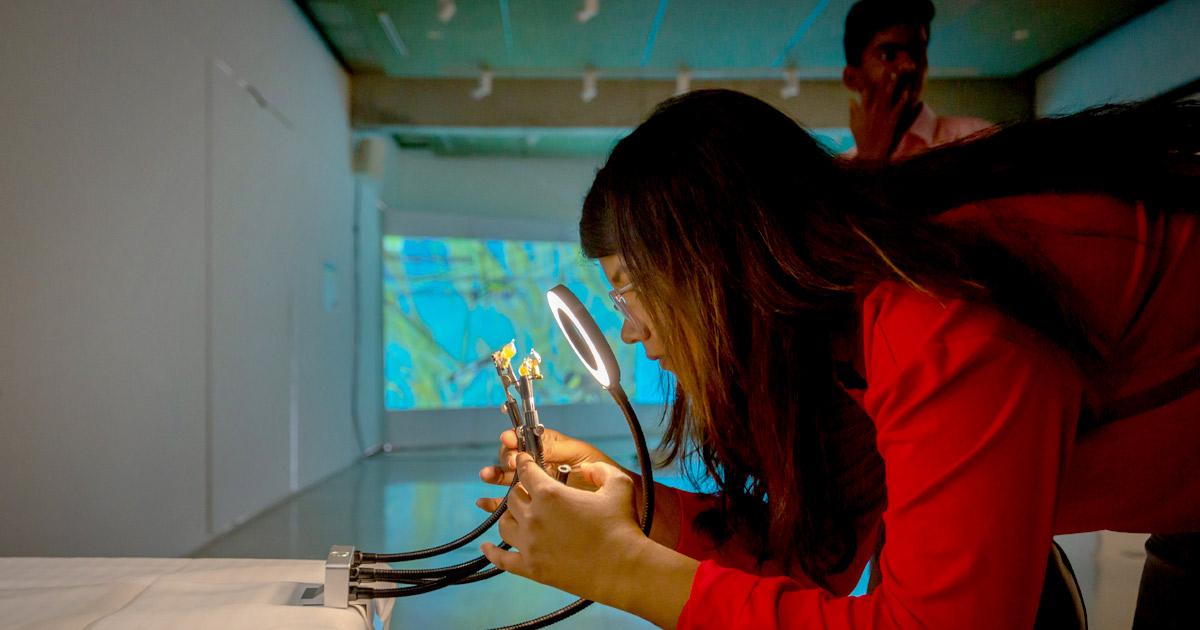 IMAGE: Pritha Kundu demonstrates her artwork Only A Game.