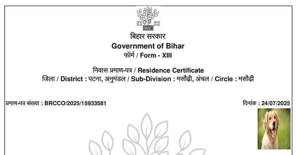 The certificate of residence was issued last week in Masaurhi circle, falling under the eponymous sub-division, apparently as part of a scramble for such documents during the special intensive revision of electoral rolls in Bihar.