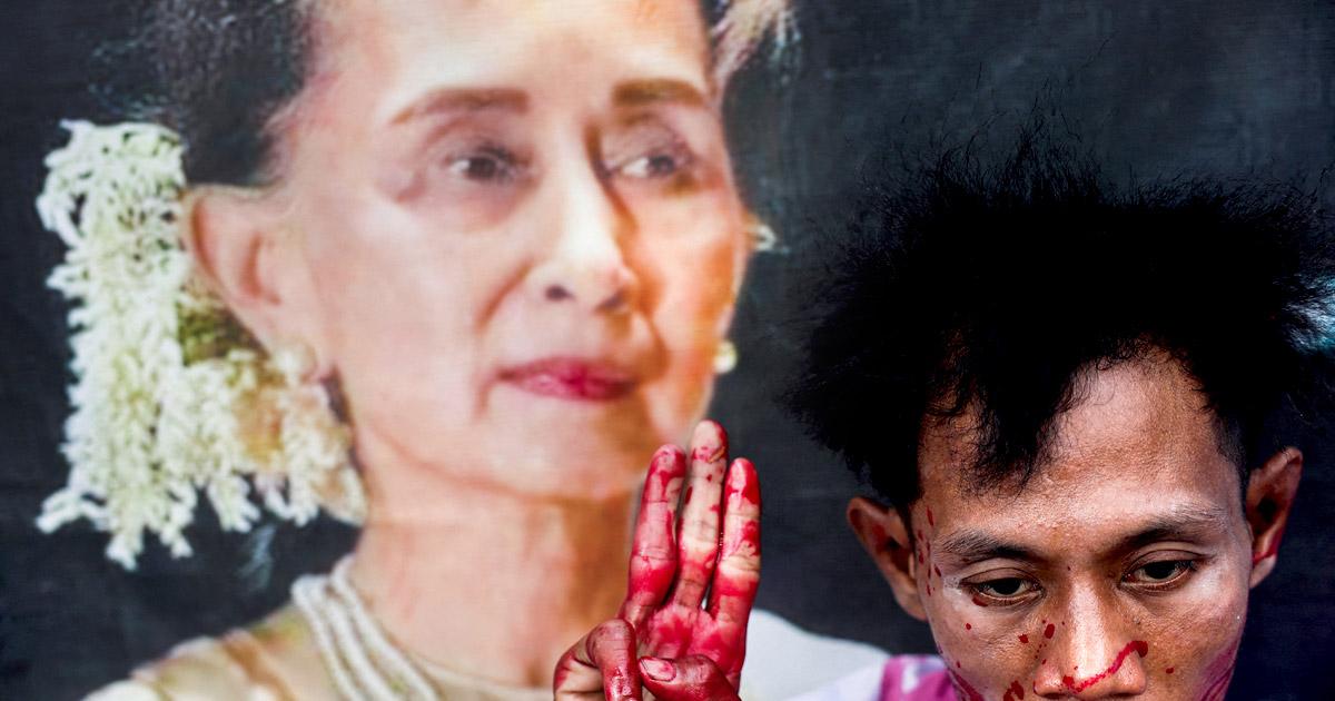 IMAGE: A protester with fake blood on his body raises a three-finger salute in a demonstration to mark the third anniversary of Myanmar's 2021 military coup, outside of the United Nations office in Bangkok, Thailand, February 1, 2024. All Photographs : Chalinee Thirasupa/Reuters