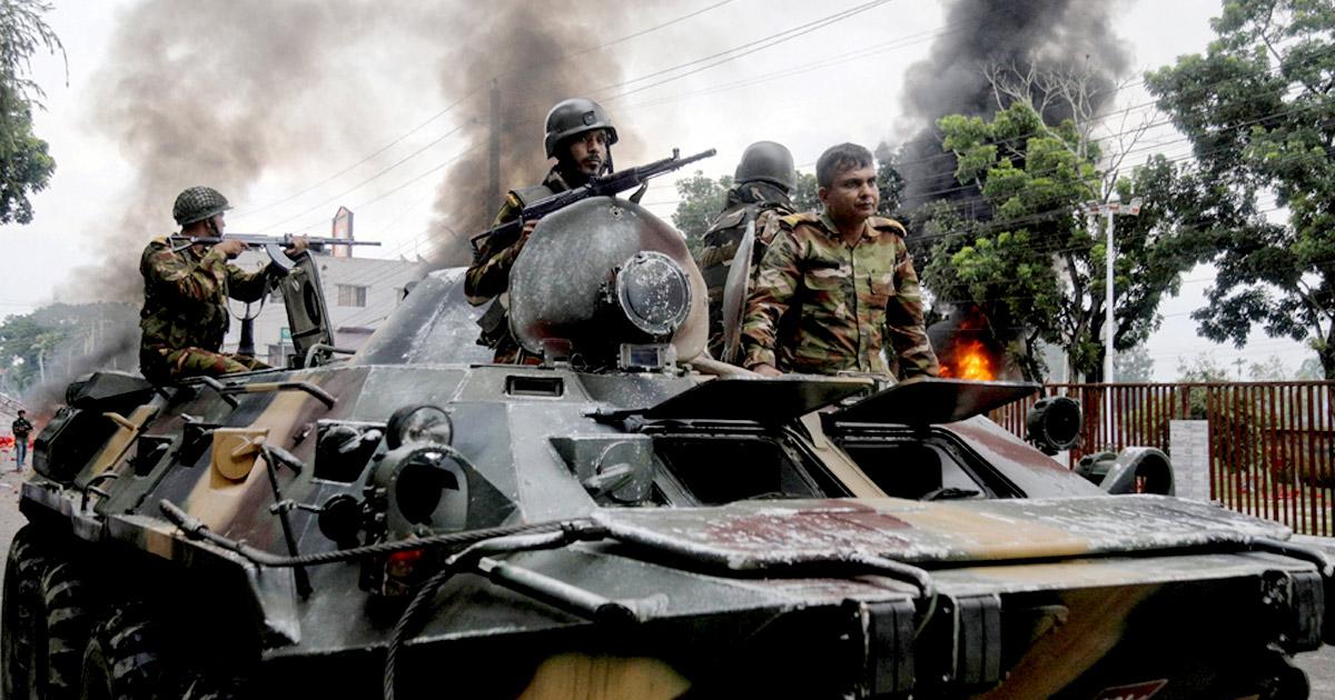IMAGE: Soldiers sit atop an Armored Personnel Carrier after armed forces were deployed following a clash during a National Citizen Party rally in Gopalganj, Bangladesh. Photograph: Anik Rahman/Reuters