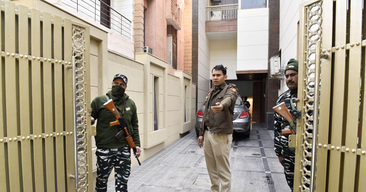 IMAGE: Security at the residence of AAP Rajya Sabha MP ND Gupta, where the Enforcement Directorate conducts a raid, in New Delhi on Tuesday, February 6, 2024. Photograph: Jitender Gupta/ANI Photo