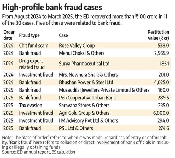 From August 2024 to March 2025, the ED recovered more than ₹100 crore in 11 of the 30 cases. Five of these were related to bank fraud.