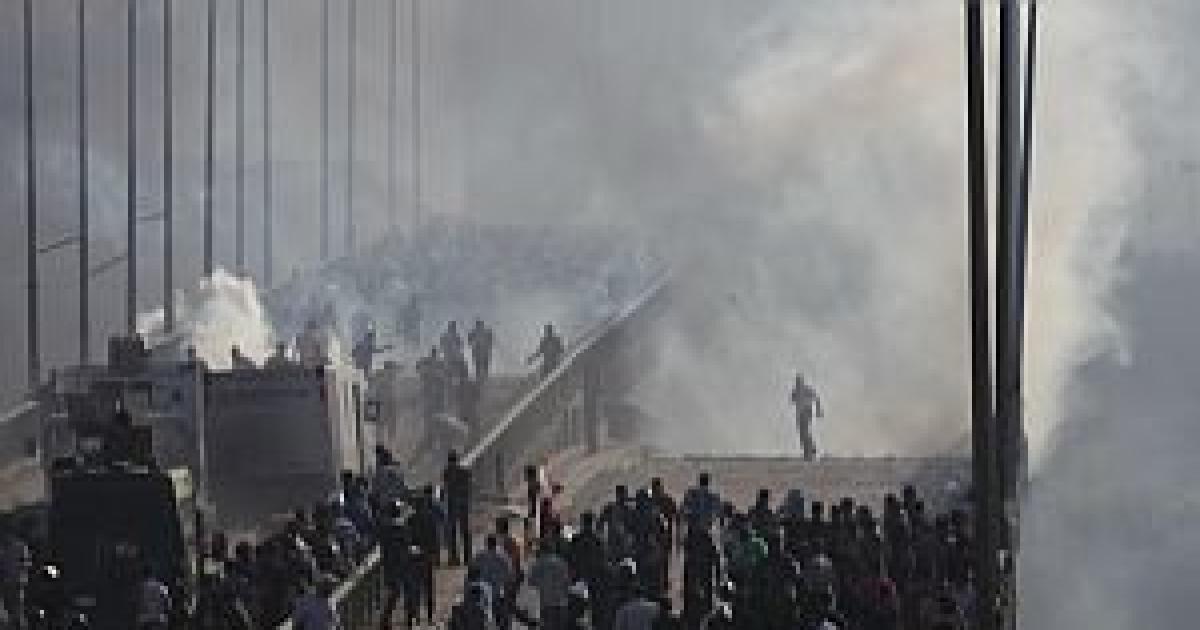 Image: Members of the Muslim Brotherhood flee from tear gas and rubber bullets fired by riot police during clashes in Cairo