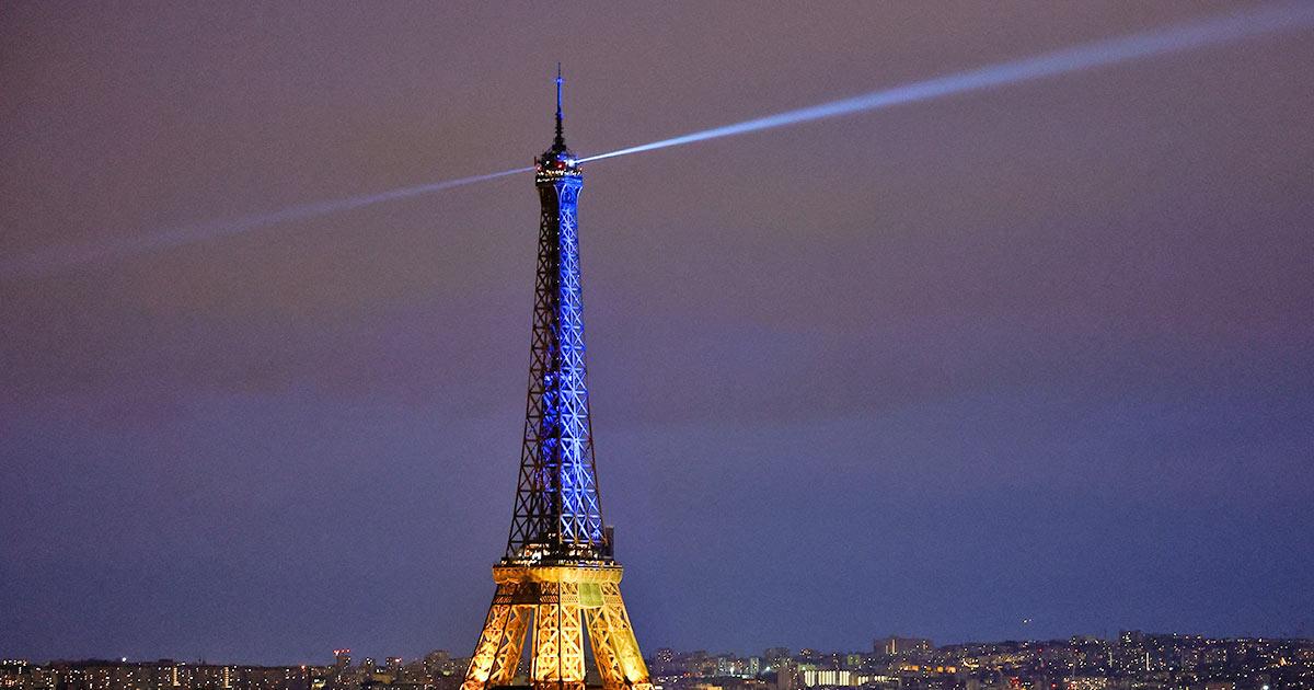IMAGE: The Eiffel Tower in Paris is lit up in the national blue-and-yellow colours of Ukraine, to mark the first anniversary of Russia's invasion of Ukraine. Photograph: Sarah Meyssonnier/Reuters