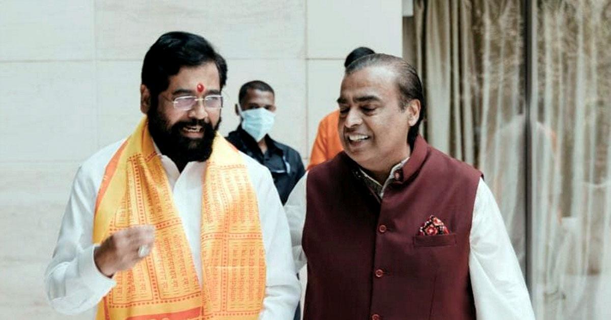 IMAGE: Eknath Shinde, left, with Reliance Chairman Mukesh Ambani after Ganpati darshan at Antilia, MDA's south Mumbai home, September 1, 2022. Photograph: PTI Photo