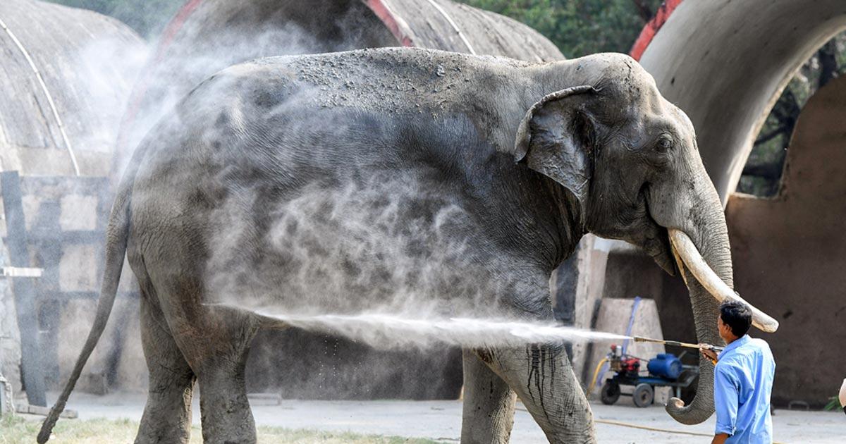 IMAGE: Elephants get a bath on a hot summer afternoon, here and below. All photographs: Shrikant Singh/ANI Photo