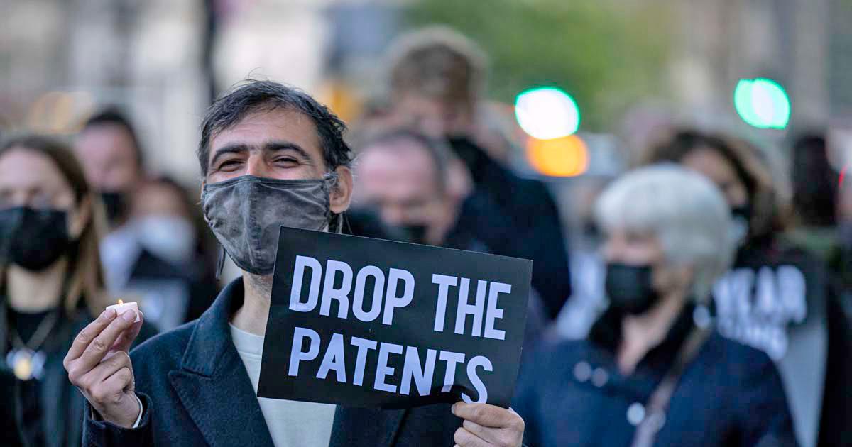 The protest, organised by Global Justice Now, wants the World Trade Organisation to suspend the enforcement of patents for coronavirus vaccines to enable poorer countries to inoculate their populations.