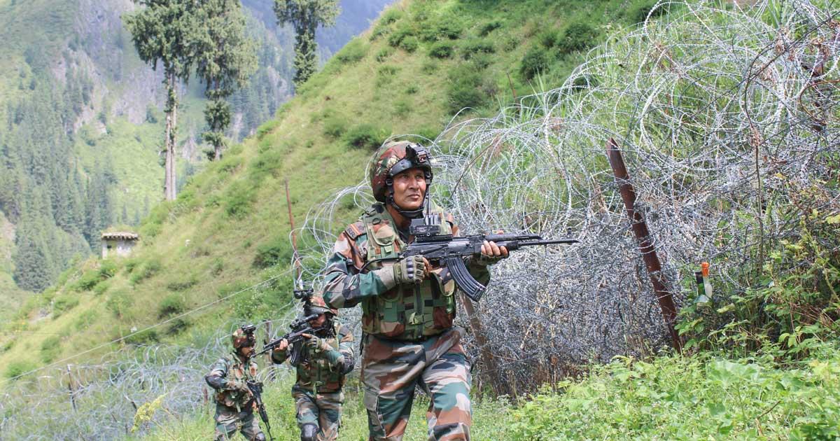 IMAGE: Soldiers patrol along the Line of Control in the Machil sector in Kupwara. All Photographs: ANI Photo
