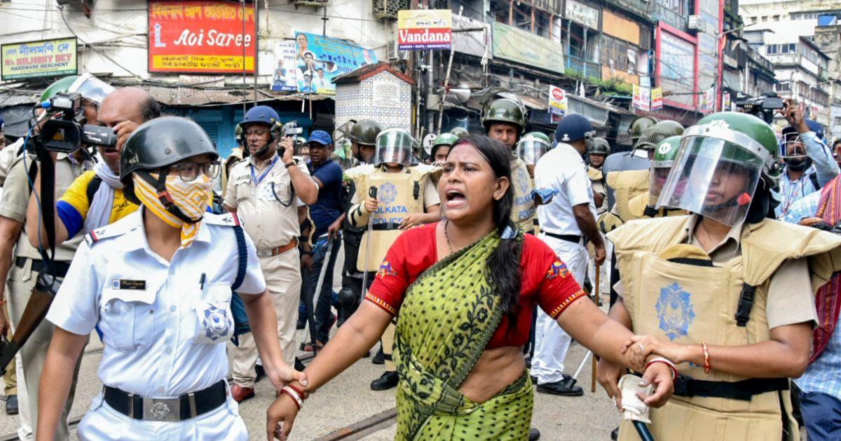 IMAGE: Police personnel detain a protestor during the Nabanna Abhijan protest against the alleged rape and murder of RG Kar Hospital doctor, in Kolkata on Tuesday, August 27, 2024. Photograph: ANI Photo