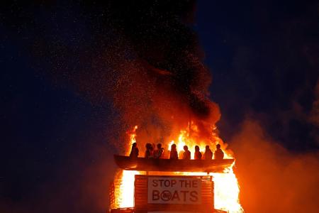 IMAGE: A loyalist bonfire featuring a model effigy of a boat containing mannequins portrayed as migrants in lifejackets, with a sign reading 'Stop the Boats', during annual bonfire events marking the 1690 Battle of the Boyne, in Moygashel, Northern Ireland, July 10, 2025. Photograph: Clodagh Kilcoyne/Reuters