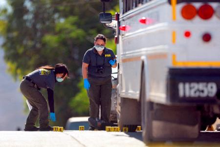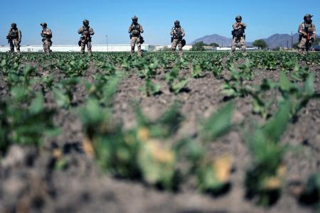 IMAGE: US federal agents stand guard in a field next to a road leading to an agricultural facility where US federal agents and immigration officers conducted an operation in Camarillo, California, USA, July 10, 2025. Photograph: Daniel Cole/Reuters