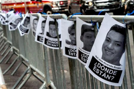 IMAGE: Images of people detained by the US Immigration and Customs Enforcement are tied to barricades outside a US immigration court in Manhattan, New York City, July 10, 2025. Photograph: David 'Dee' Delgado/Reuters