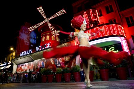 IMAGE: A French Cancan dancer performs in front of the Moulin Rouge cabaret during celebrations marking the restart of its iconic windmill with red sails in Paris, July 10, 2025. Photograph: Tom Nicholson/Reuters