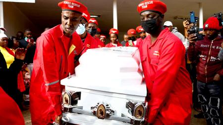 IMAGE: Pallbearers carry the coffin of slain hawker Boniface Kariuki, who was shot in the head by police during protests last month, ahead of his burial at the Kenyatta University Funeral Home in Nairobi, Kenya, July 11, 2025. Photograph: Thomas Mukoya/Reuters