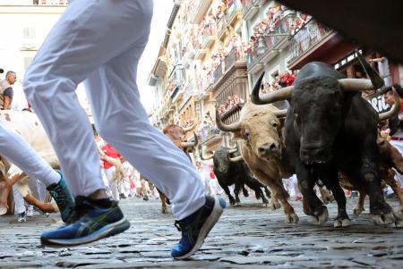 IMAGE: Revellers sprint next to Jandilla fighting bulls during the Encierro (running of the bulls), during the San Fermin festival in Pamplona, Spain, July 10, 2025. Photograph: Albert Gea/Reuters