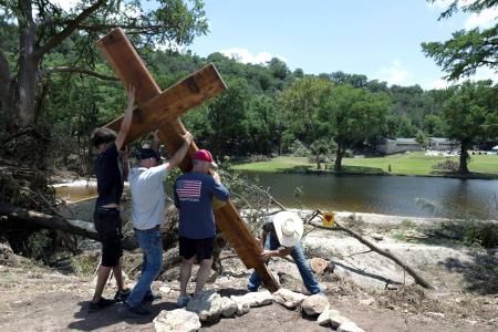 IMAGE: People place a cross by the Guadalupe river, across from Camp Mystic, following deadly flooding, in Hunt, Texas, USA, July 10, 2025. Photograph: Umit Bektas/Reuters
