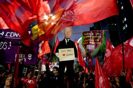 IMAGE: Demonstrators take part in a protest against US President Donald J Trump's announcement of 50% tariffs on Brazilian products in Sao Paulo, Brazil, July 10, 2025. Photograph: Alexandre Meneghini/Reuters