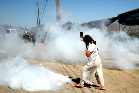 IMAGE: A woman holds a cellphone and covers her face as US federal agents use tear gas while blocking a road leading to an agricultural facility in Camarillo, California, USA, July 10, 2025.. Photograph: Daniel Cole/Reuters