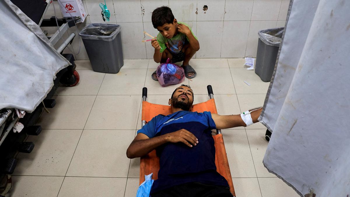 IMAGE: A Palestinian boy observes his father, who was wounded in morning Israeli strikes on tents sheltering displaced people, as his father receives treatment, according to medics, at the Nasser Hospital in Khan Younis, southern Gaza Strip. Photograph: Hatem Khaled/Reuters