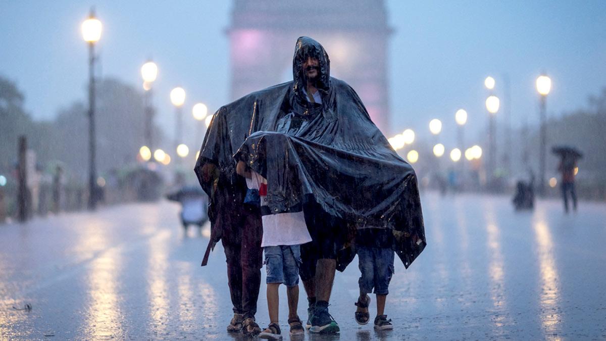 IMAGE: A family uses a plastic sheet to protect themselves during heavy rains in New Delhi. Photograph: Adnan Abidi/Reuters