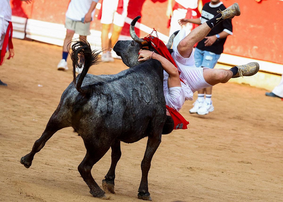 IMAGE: A reveller is tossed by a wild cow at the bullring, at the San Fermin festival in Pamplona, Spain. Photograph: Albert Gea/Reuters