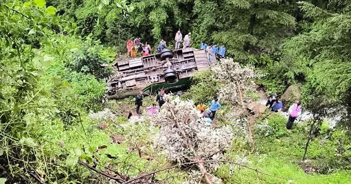 IMAGE: Passengers get out and stand around a bus after it fell into a deep gorge in Mandi. Photograph: ANI Photo