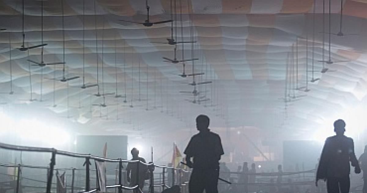 Image: A policeman stands under an empty smoke-filled marquee after Ramdev supporters were dispersed by teargas