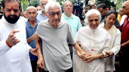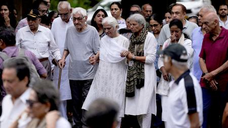 IMAGE: Mr Pushkaraj Sabharwal, accompanied by his daughter, being escorted to the crematorium where he performed the last rites for his son, here and below