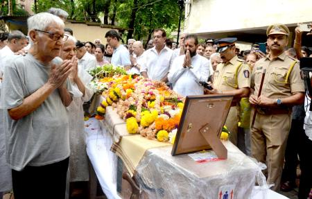 IMAGE: Colleagues, friends and neighbours pay their respects to Captain Sabharwal at Jal Vayu Vihar in Powai, north east Mumbai, the housing colony where the Air India pilot, a bachelor, lived with his father.