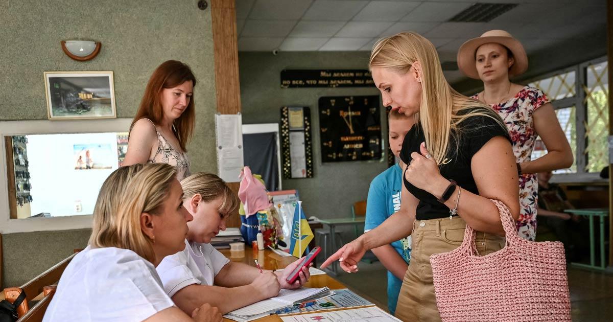 IMAGE: People line up to receive humanitarian help organised by the municipality in Kostyantynivka. Photograph: Ammar Awad/Reuters