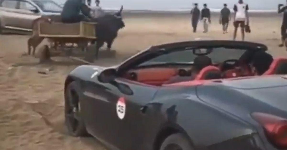 It was the humble bullock cart which saved the day for the mighty Ferrari that became stuck in sand at a beach in Alibaug near Mumbai, according to a viral video.