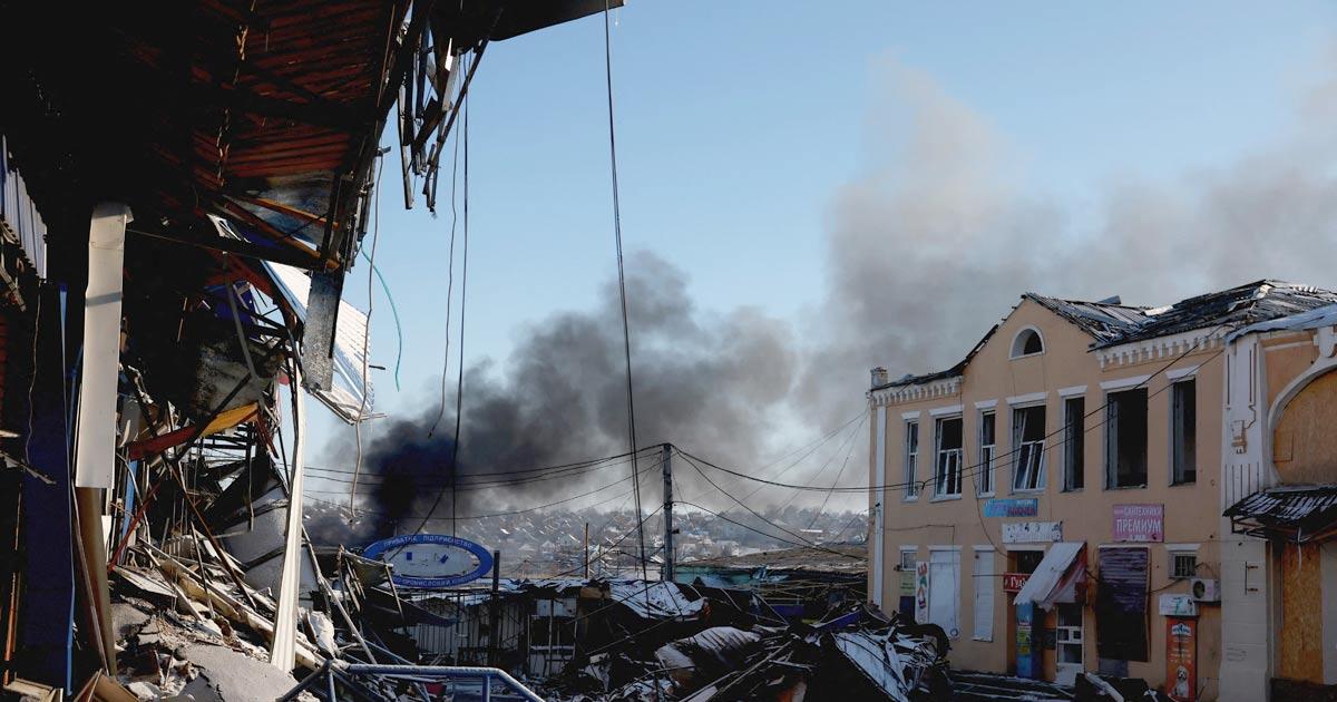 IMAGE: Ukrainian firefighters work at the site of a market destroyed by a Russian missile strike in Shevchenkove town, Kharkiv region. Photograph: Sofiia Gatilova/Reuters