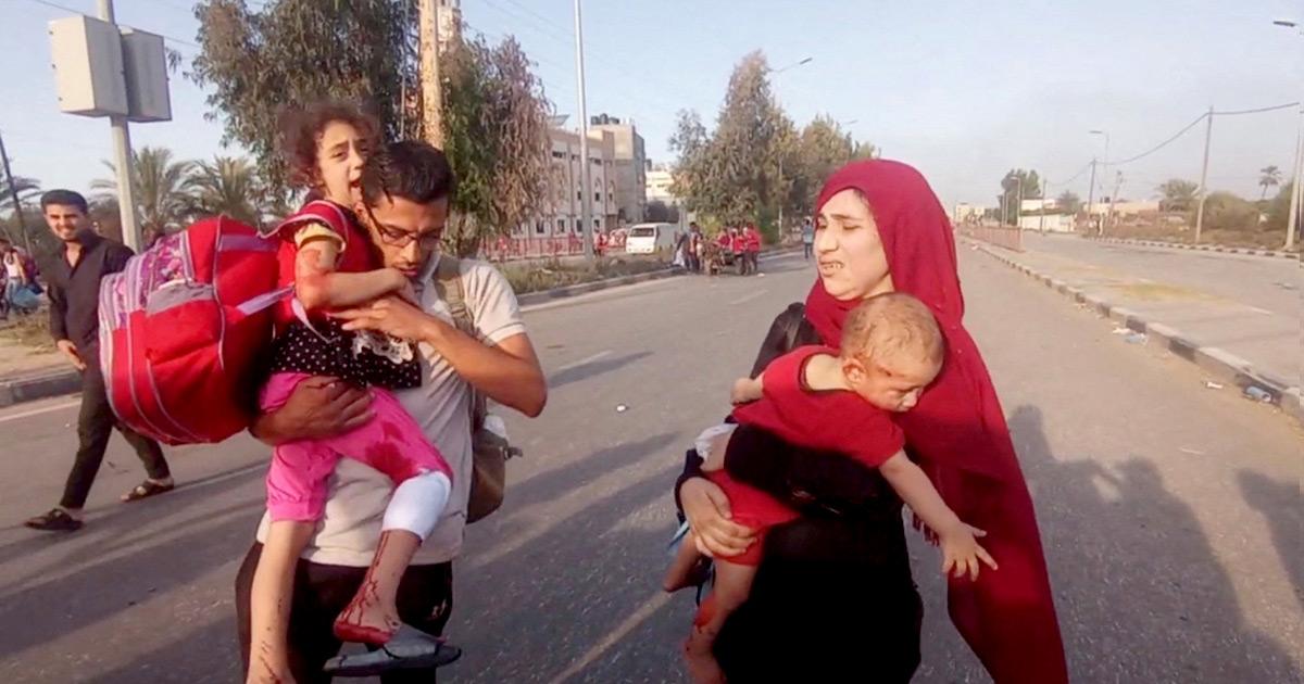 IMAGE: Palestinians carry their children, who were wounded in an Israeli strike while moving southward after fleeing north Gaza as Israeli tanks roll deeper into the enclave on Salah al-Din road in central Gaza in this still picture taken from a video November 10, 2023. Photograph: Fadi Shana/Reuters