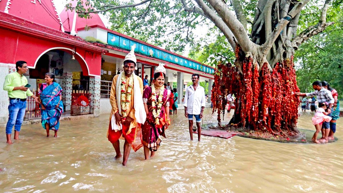 IMAGE: A newly married couple after getting married at the waterlogged Kankali Kali temple in Birbhum, West Bengal, inundated with the flood water of the Kopai river. Photograph: ANI Photo
