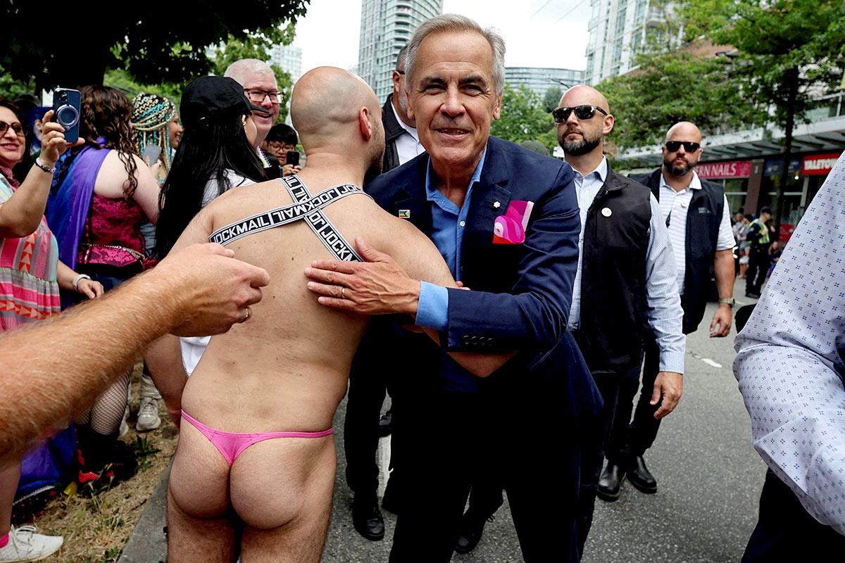 IMAGE: SENSITIVE MATERIAL. THIS IMAGE MAY OFFEND OR DISTURB Canada's Prime Minister Mark Carney greets an attendee at the Vancouver Pride Parade in Vancouver, British Columbia, Canada. Photograph: Chris Helgren/Reuters