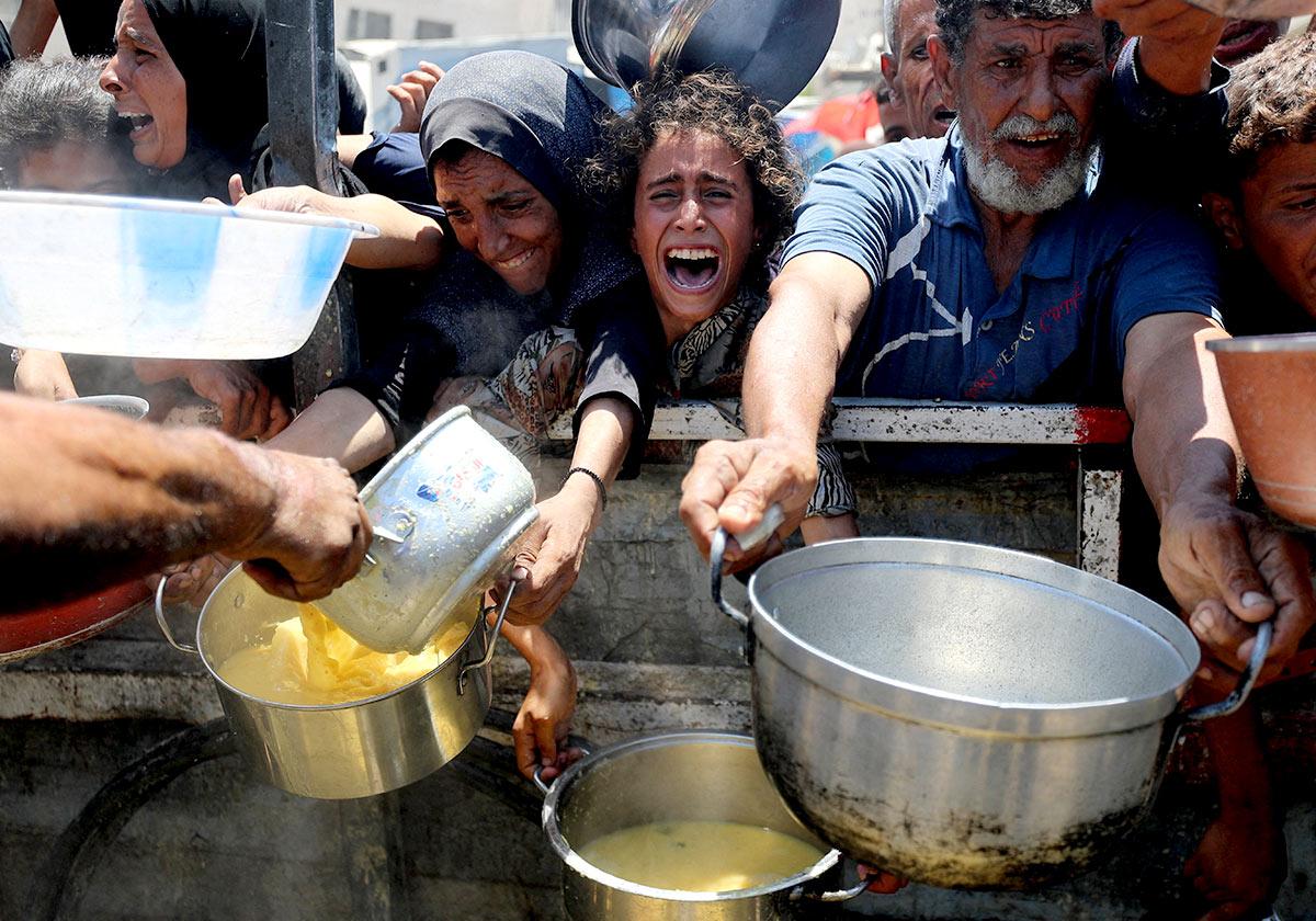 IMAGE: Palestinians wait to receive food from a charity kitchen amid the hunger crisis in Gaza City. Photograph: Mahmoud Issa/Reuters