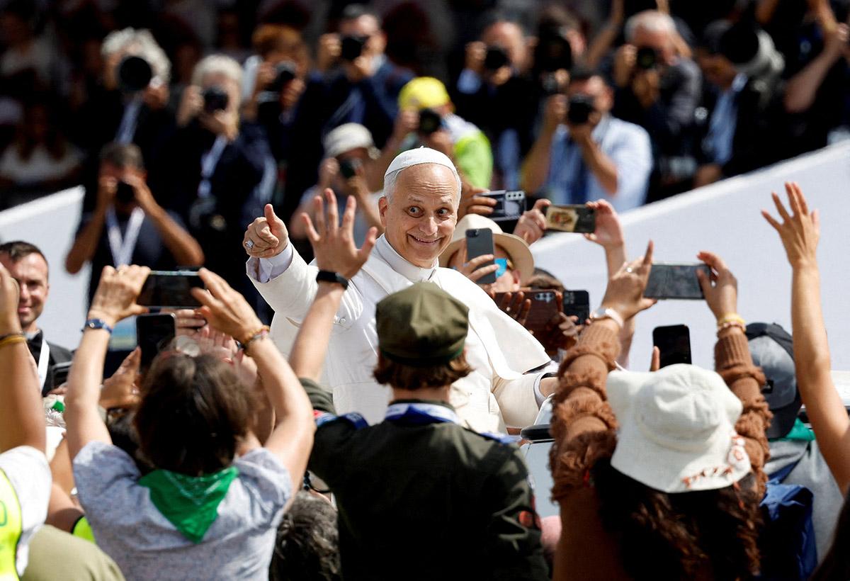 IMAGE: Pope Leo waves to the faithful from the popemobile as he leaves after attending the Mass for Jubilee of Youth in Tor Vergata. Photograph: Remo Casilli/Reuters