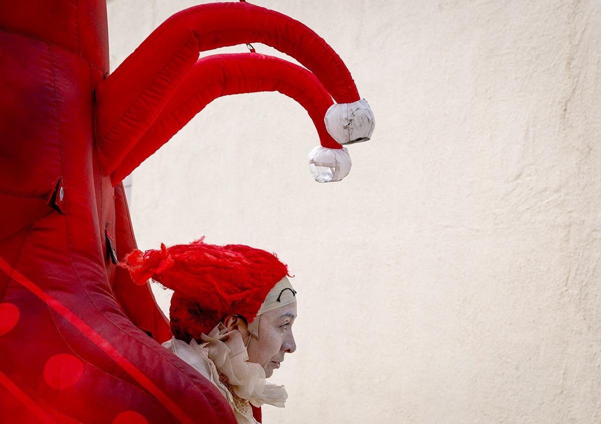 IMAGE: An artist performs during the street circus festival Karandash-fest, in memory of the famous Soviet clown Mikhail Rumyantsev, known under his stage name Karandash, in Staritsa, Tver region, Russia. Photograph: Evgenia Novozhenina/Reuters